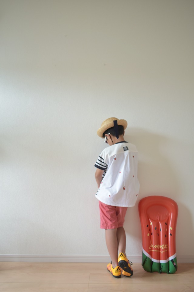 男の子も女の子もOKユニセックスデザイン スイカ刺繍生地 サイドタックTシャツ(size90−150)
