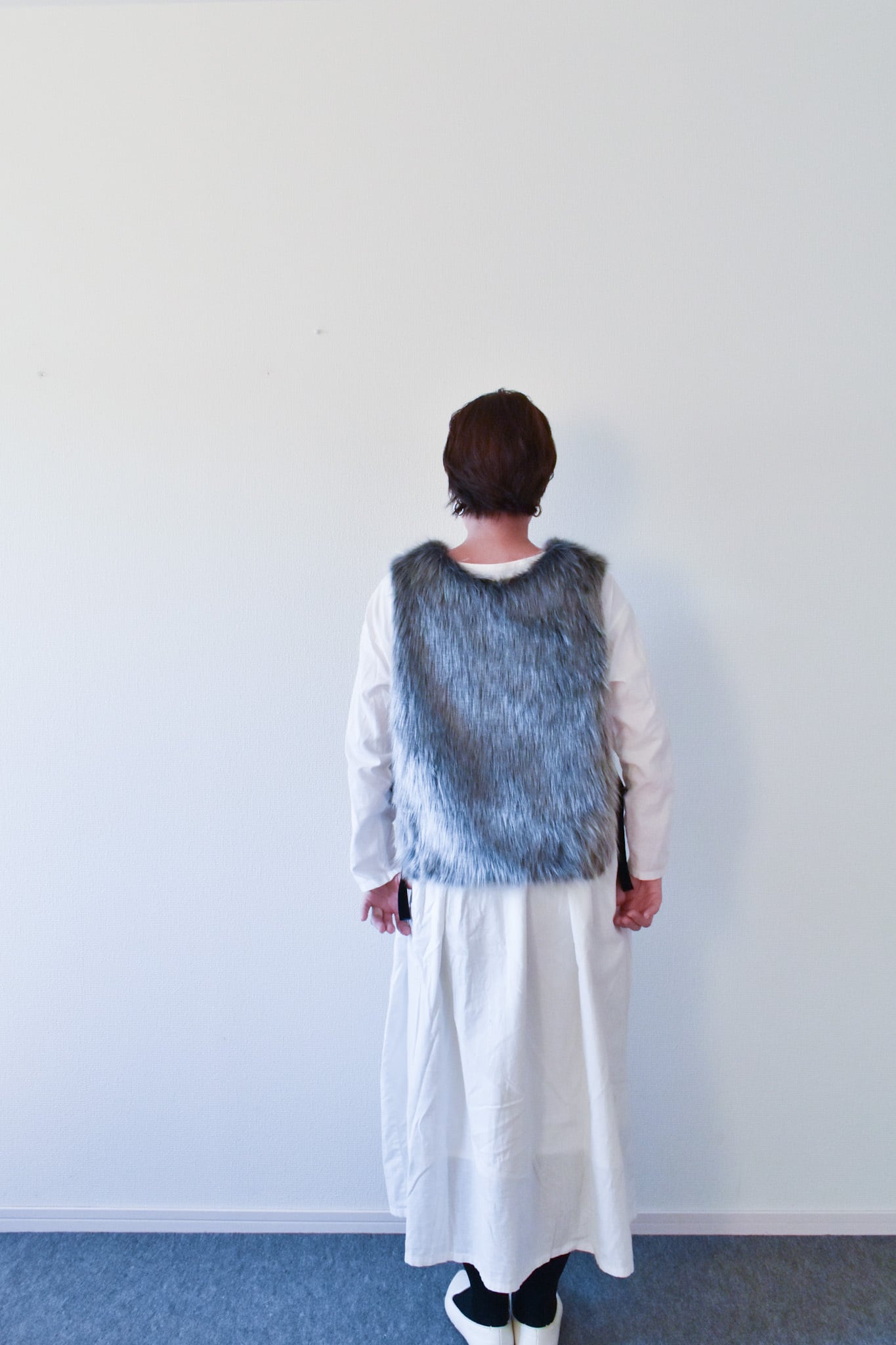 洗練されたデザインの"ミックスグレーの毛並み長めのファーベスト"は、毛並みの豊かさが魅力の一着です。このスタイルは、シンプルでありながらも、一目で印象に残る特別感を持っています。