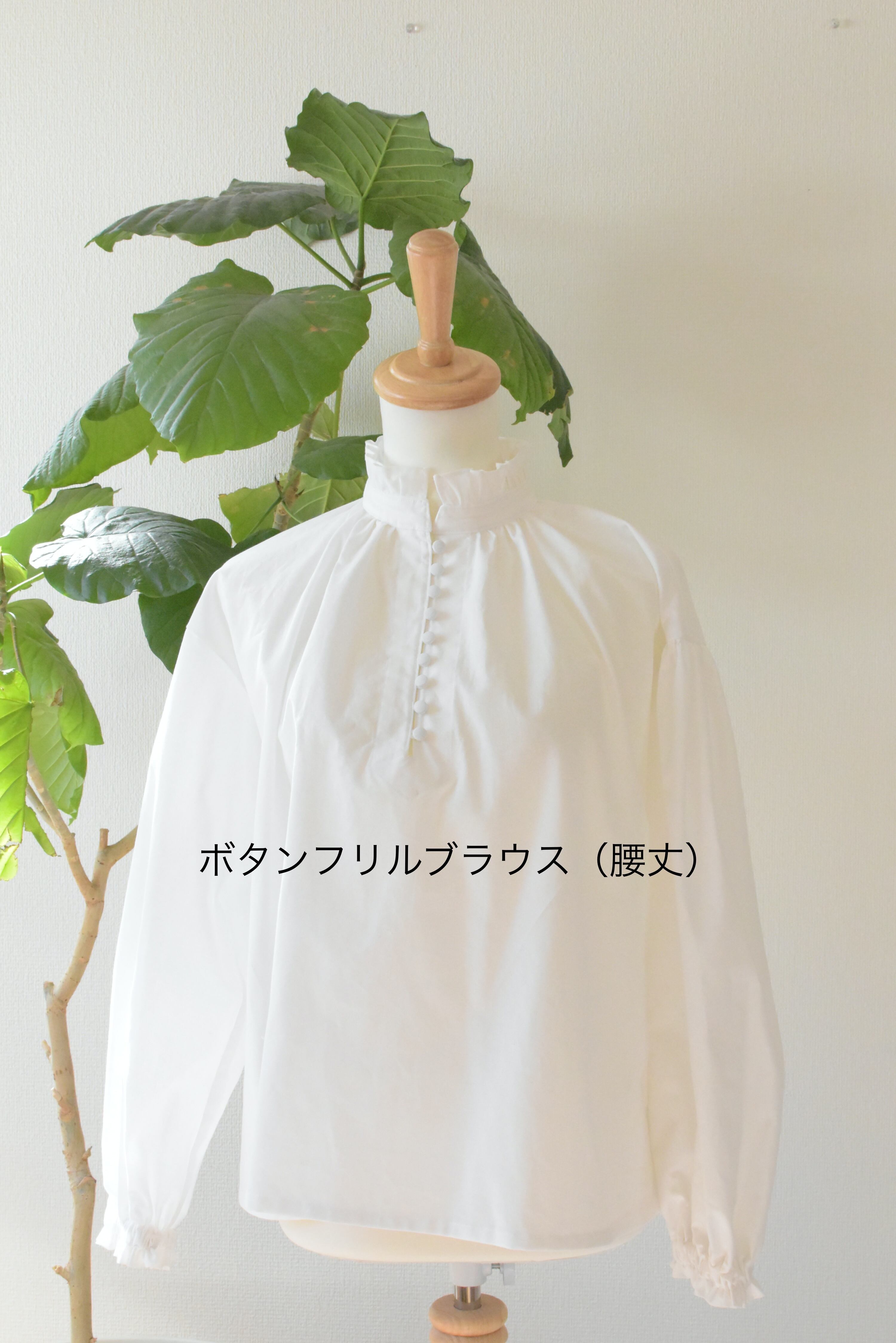【ボタンフリルブラウス(腰丈)】前後の長さがほぼ同じで、首元がフリルになっていて、お袖にボリュームがあるフリルブラウス です。開閉は、開きになっていて、ボタンが9個ついています。袖口はゴムになっています。