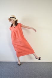【受注生産】Vネックラインが着痩せ効果抜群 リネン100%ワンピース〜オレンジ〜