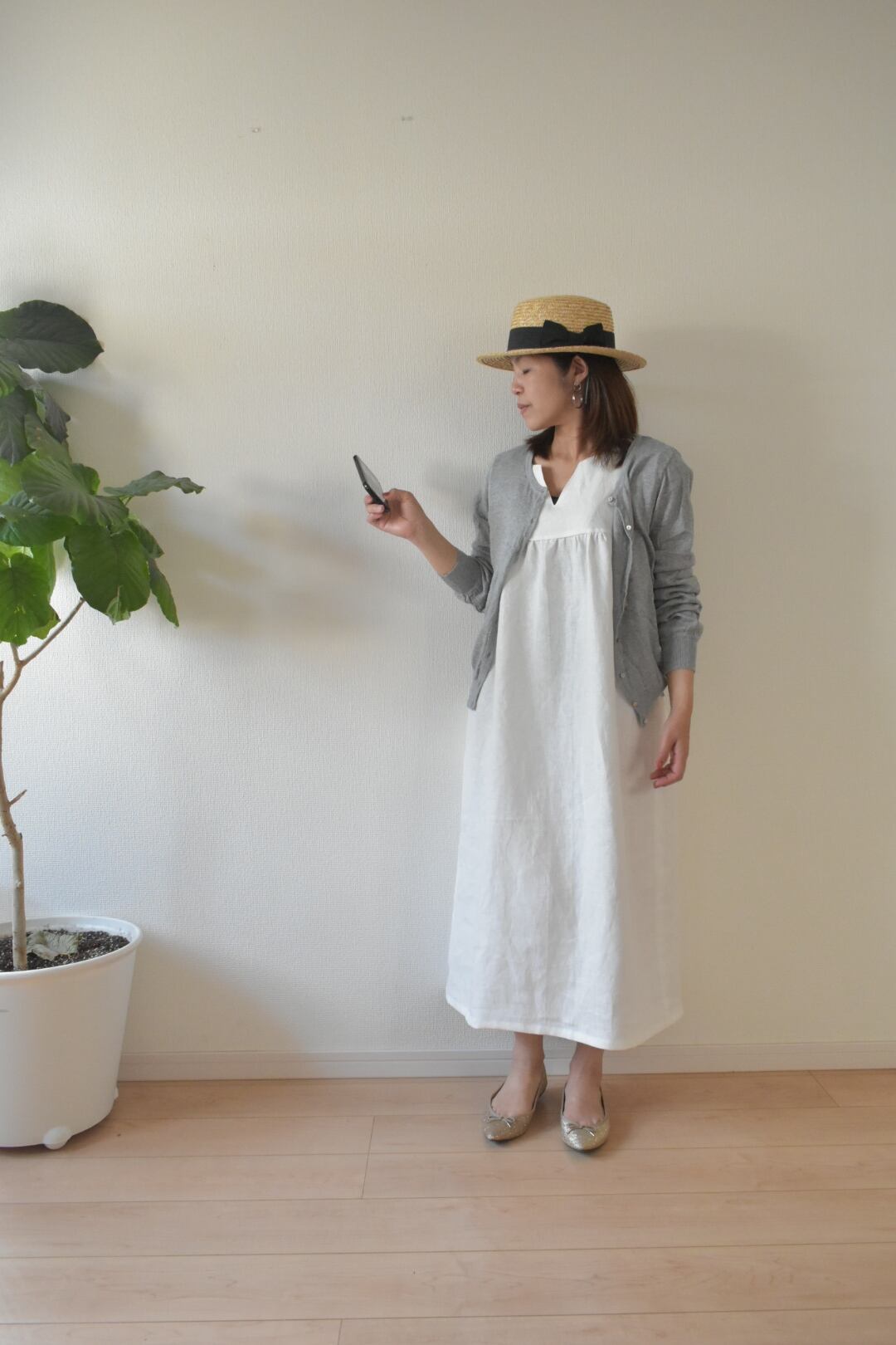 【即発送sizeL】Vネックラインが着痩せ効果抜群 リネン100%ワンピース〜ホワイト〜