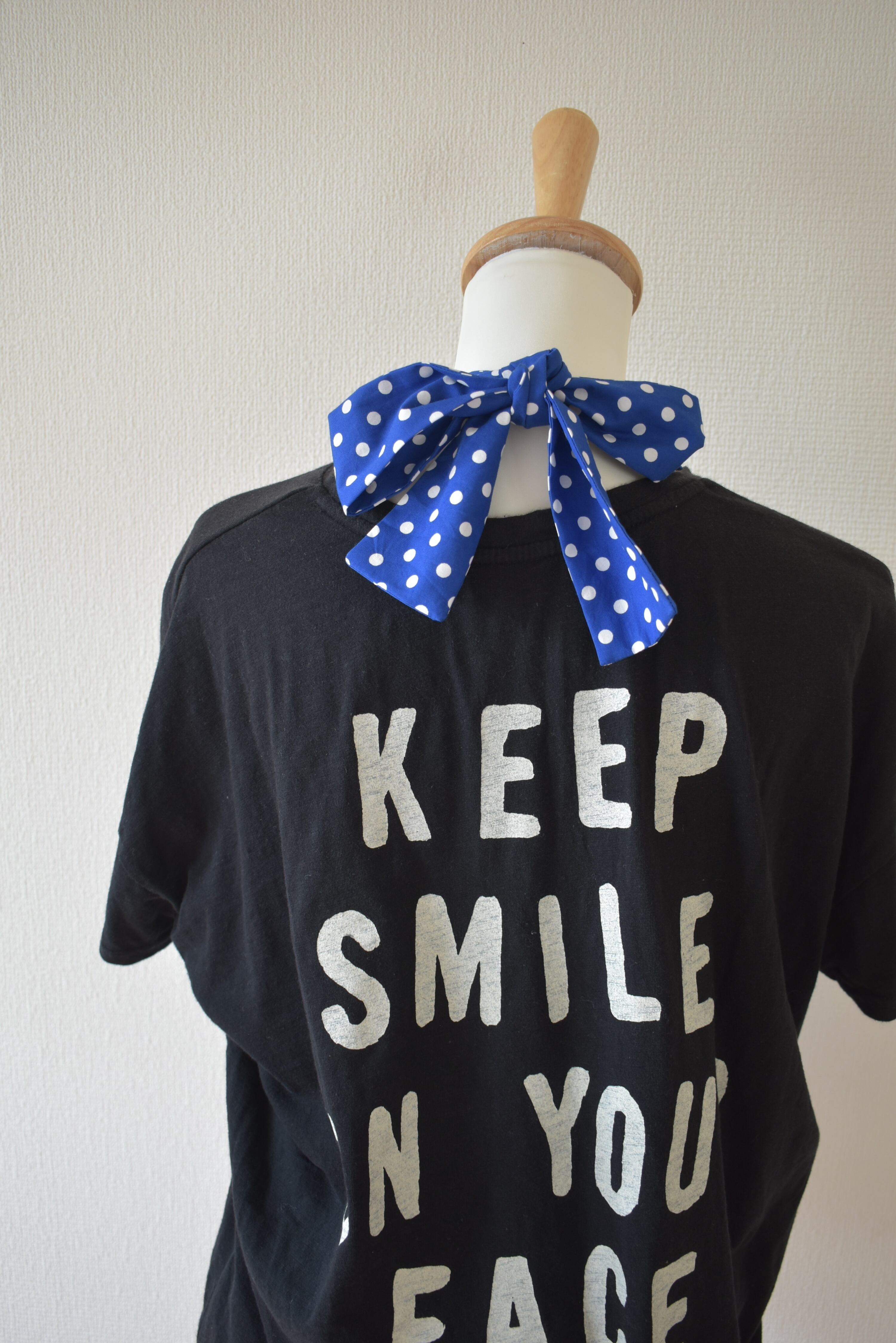 後ろ部分はゴムが入っていて、首の後ろでリボンを結ぶ形になっています。