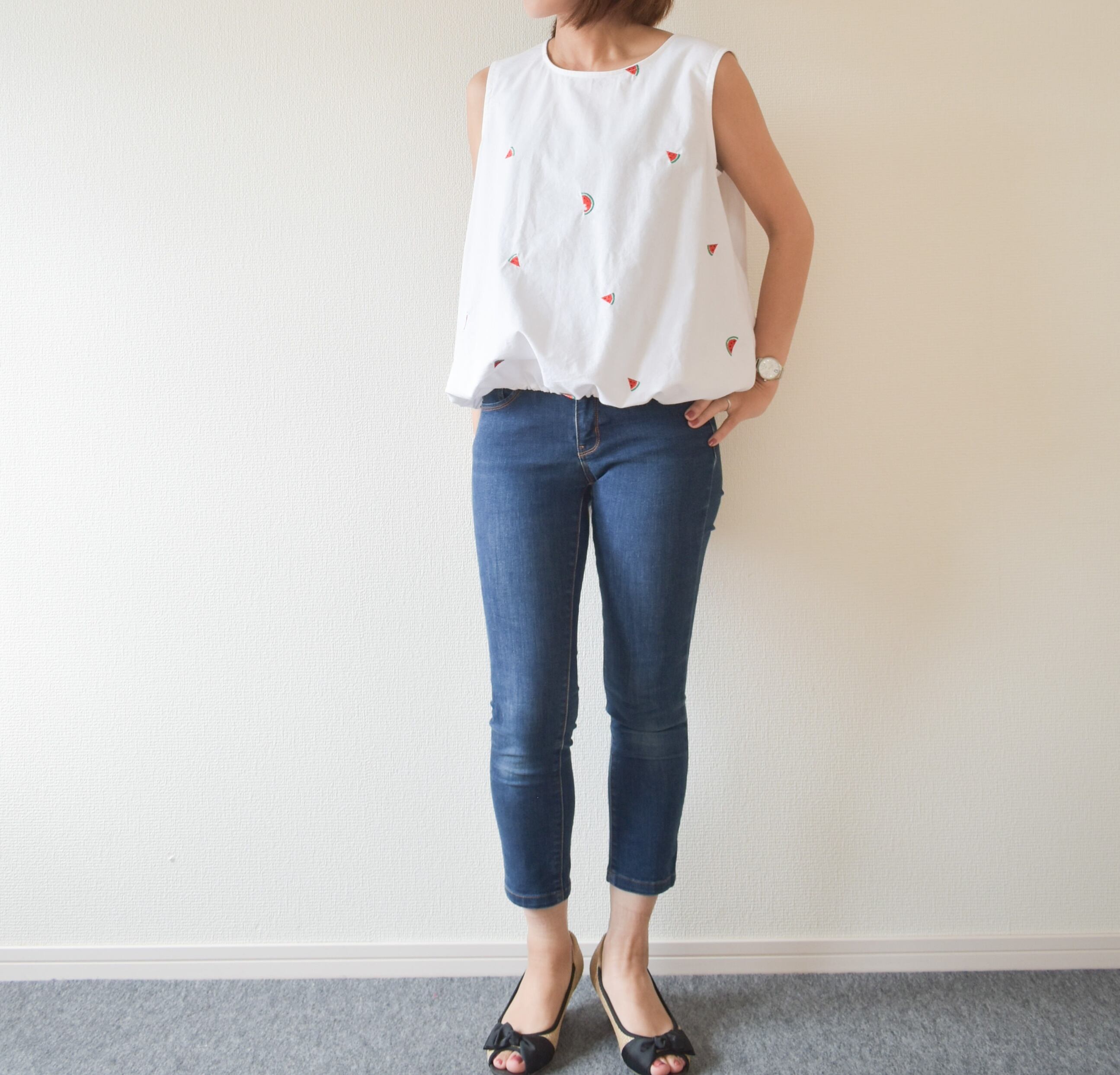 あえてノースリーブにしたのは、暑い夏と言う事もありますが、クーラーで寒くなった時、カーデを着てももたつかないようにしました。