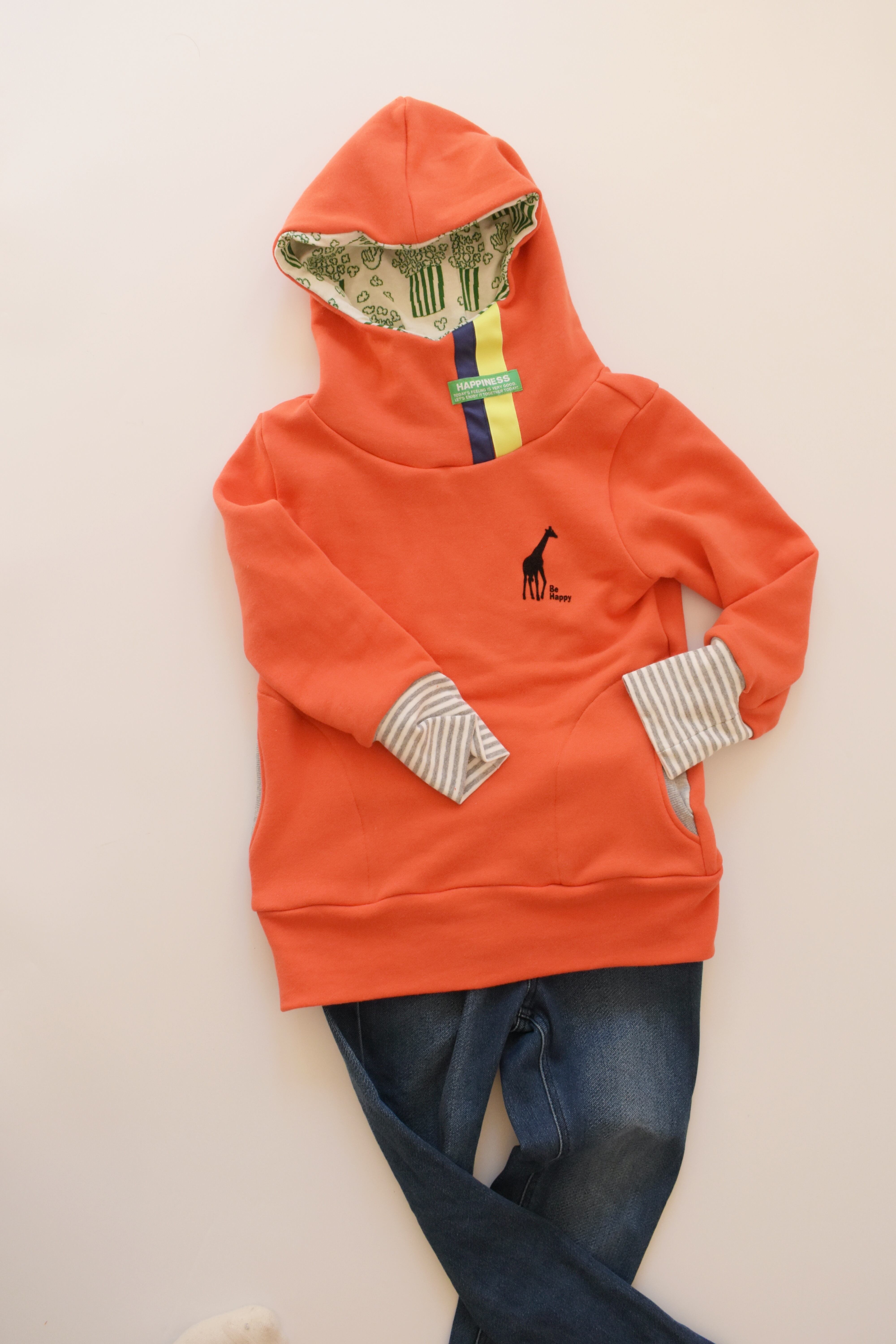 ●首元まで暖かい、タートルのようなフードがついているトレーナーです。