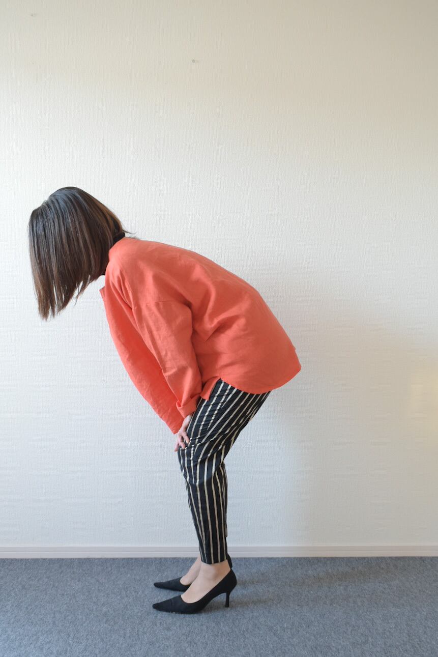 ●前後の長さが違います。前見頃は短め。後ろ身頃はお尻が隠れる長さです。(モデル156㎝)