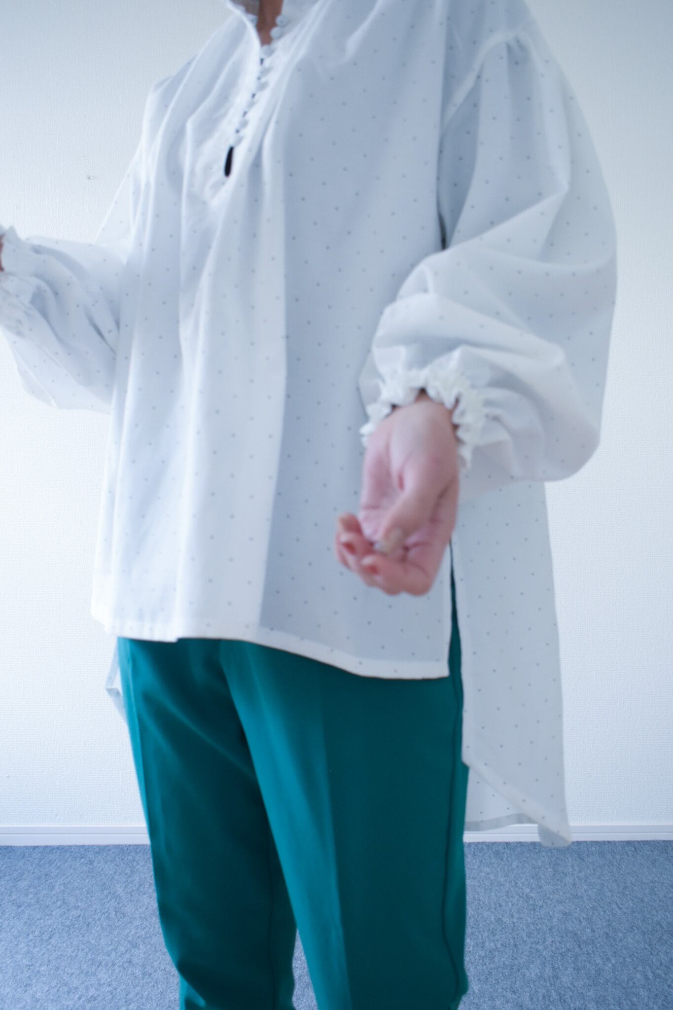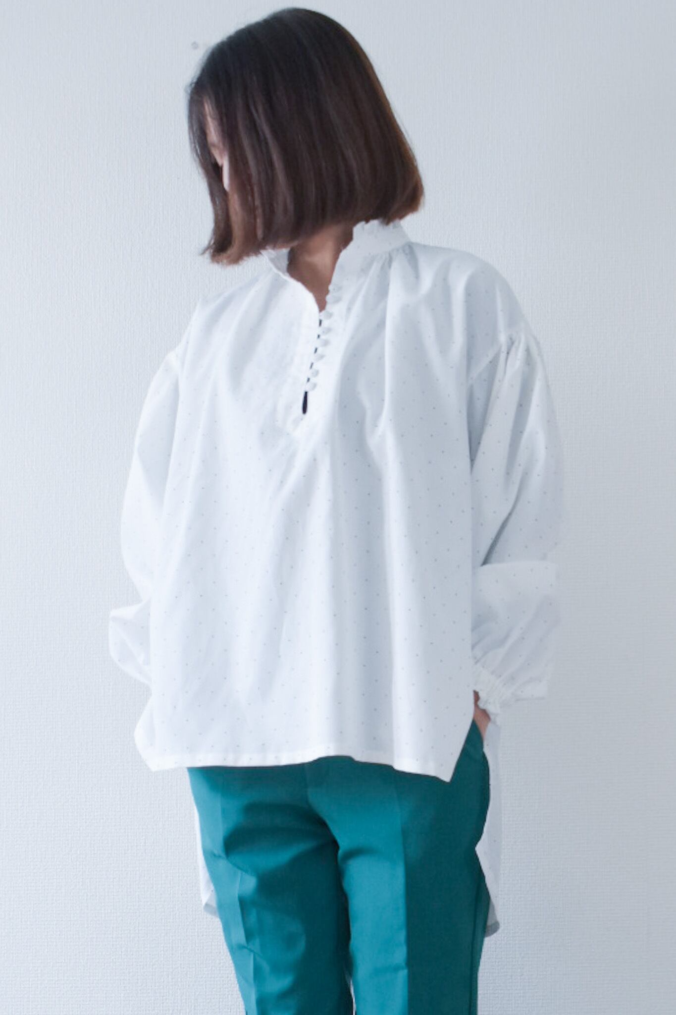 春のお出かけが楽しくなる スモールドットの丈夫なポプリン生地 前ボタン9個 チビチビフリルがポイント 女性らしさを忘れないボリュームブラウス
